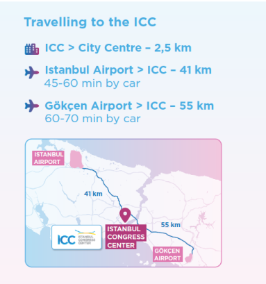 Getting to the Istanbul Congress Centre (ICC) is easy by taxi or public transport. Taxis from Istanbul Airport (European Side) take around 37 minutes, and from Sabiha Gökçen Airport (Anatolian Side) around 55 minutes.